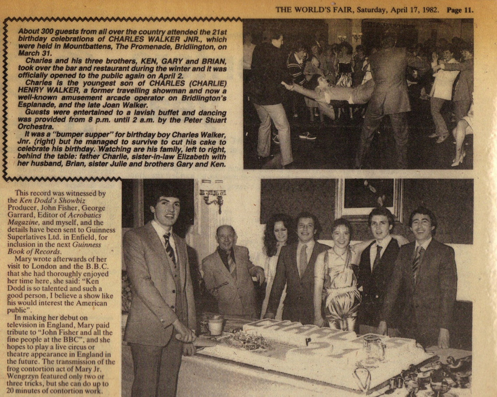 Page 4 The Lounge enters the age of the multi-leisure complex and the discotheque by Wes Walker In spite of the contraction of both the praedium and with it the original volume of ambition, the new results maintained their combine of several different areas: a new multi-level stage construction gave way to the Discotheque (then at its peak), with the first of its house deejays plucked from BBC radio shows. Instead of concealed high-powered movie projectors, the investment would be in the area’s first video wall. The instantly foreseeable first floor phase was opening up into another sequence of bar areas, with a family vicinity accessible from a fourth (separately stair-cased) entrance at the edge of 26, Promenade. On the upper level, areas were separated by partitions being installed between the entassis of white-pillared quarters of ornate plaster, their inset panels upholstered in flock and fabric. Areas were segregated with western saloon swing doors. This division had its own ancillary kitchens installed to serve families (during the summers) and wedding receptions. At the cost of thousands, the floors had been made soundproofed to counter against decibel levels. The same news article went on to unveil the new Front Bar-Reception area: “…fronting onto the Promenade and open during normal licensing hours, [it] has been completely refurbished. The new walls and free-standing furniture is all in dark oak with red Dralon”. Nightly shows were organised to run throughout the season each evening until 2am. Aiming at an age range of 20 upwards, the article observed that “notices displayed show that they are insisting on a good standard of dress”, which pointed towards a flip-side for the venue: an alter-ego preserving that more elegant touch. Way in advance, its bookings were full for dinner dances (passé by today’s post-wine-dine culture), so in a nod to its distinguished past Mountbattens gained itself a set of silver service waitresses. LOSS OF CINEMA It was intended for the loss of cinema to be remedied by the addition of a new Late-Night Movie Theatre for young couples and newlyweds – specifically booking and showing their sorts of films aside from the discotheque – to be accommodated behind the kitchens, staggered along from the old cinema quarter. But as the first busy season railroaded them into the demands of the next, the idea never came to fruition in form of the original intention; they even had a new cinema screen on order from Harkness-Sayers, on which a hefty deposit was forfeited. (EMI had closed the almost adjacent ABPC-Regal nearly a decade before). Thus, the main Mountbattens frontage became 22 to 24 Promenade, minus its magnificent old high-canopy by this stage, which had joined its appendage in shared desuetude. The 15 to 17 Esplanade end on the site of Sandon House had very recently been bisected to contribute that extra land to the Lings, and to accommodate (at no. 17) The Exhibition Rock Factory for ‘Askhams for Rock’, which Mountbattens curiously and openly retained access to through a tall sequence of sliding glass doors. Another partial retention was of the central wide cinema staircase and the quarters to which it led. Despite the parameter sacrifice of its footprint, a continuance of the graded plan now placed use on a long passageway running from the seafront into Mountbattens, still with the old wrought iron and oak marking of ‘The Lounge’ fixed high above. The old Banqueting Hall, the remainder which was renamed in 1981/82 ‘The Viceroy Rooms’, seated a safety maximum crowd of 350; over a dozen long refectory tables could comfortably be distanced around the main Viceroy while allowing room for a fifty-square-feet centrepiece. The different divisions of the development that did eventually open, when combined, could safely host up to a thousand revellers. Extensive advertising was arranged; special pull-out sections in regional newspapers combined a good editorial with advertising to the associated contractors. Running from one of the newspapers: “Major structural alterations have been carried out to the building including the installation of a new frontage incorporating bow-fronted windows … currently [the Walkers] are considering plans to develop the further floors of the property. The rear of the modernised premises used to be the original Lounge Cinema which seated approximately one-thousand cinemagoers until the last show in 1963. One feature of the original cinema, about which many Bridlingtonians knew nothing, was the existence of some one-hundred-and-fifty feet of underground passageway under the cinema for access and egress; the cinema part of the building was sold off. One feature of Mountbattens is that there is not another building like it for electrical effects. Special lighting, and lighting wired to sound, is installed providing practically every effect which could be desired.” Walker went to the great expense of having Dolbys produce the waxworks multi-track sound wiring, and one assumes that they too were brought in for Mountbattens amid the great injection of electronics. Prior to finding priority among the developmental phases, several rooms across the third and fourth floors stored Walkers Tussauds’ superfluous props and models. Following signs of intruders high up in the building, a young constable was assigned to investigate some time after the event had passed that night. Brian led him upstairs and didn’t let on that it was his prop coffin lying there on the floor, covered in cobwebs, in which one of the staff, who had decided to go along with the plan, was hiding in wait. “I don’t know what that’s doing there”, Brian shakily said to the petrified policeman: “Go on, you check inside – you’re the policeman!”. As the youthful copper gingerly ventured to lift back the coffin lid, Brian and cohort let out a bellowing cry of horror, and the whey-faced policeman – stumbling over all the 